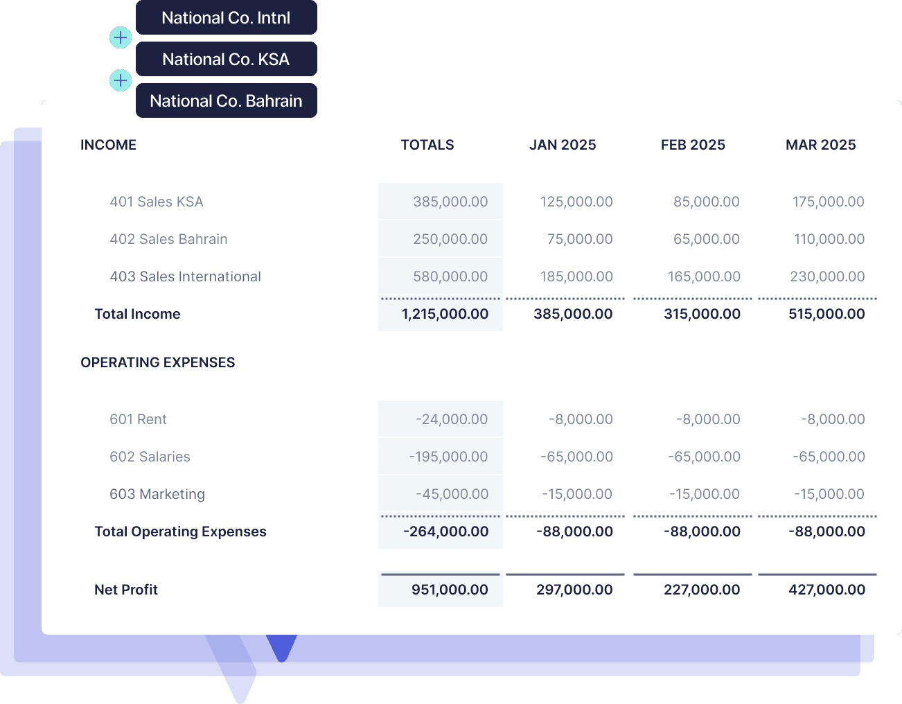 Consolidating financial statements manually is a big hassle. With Wafeq, you can do it with a single click, even if organizations have different functional currencies.