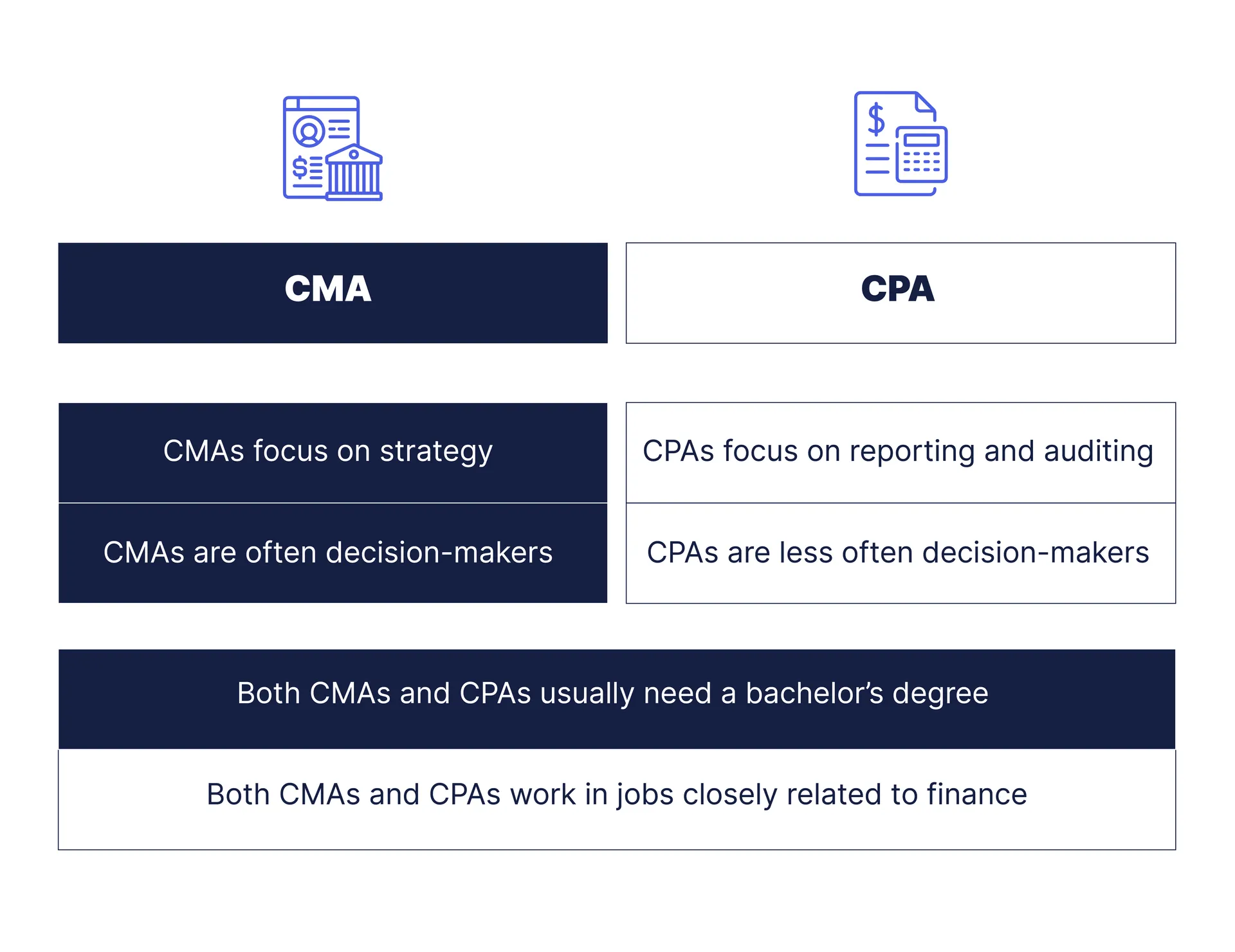 CPAs are largely focused on analyzing and reporting financial information, processing taxes, and doing audits of a company's financial records, in contrast to CMAs, who are primarily concerned with strategy and management.